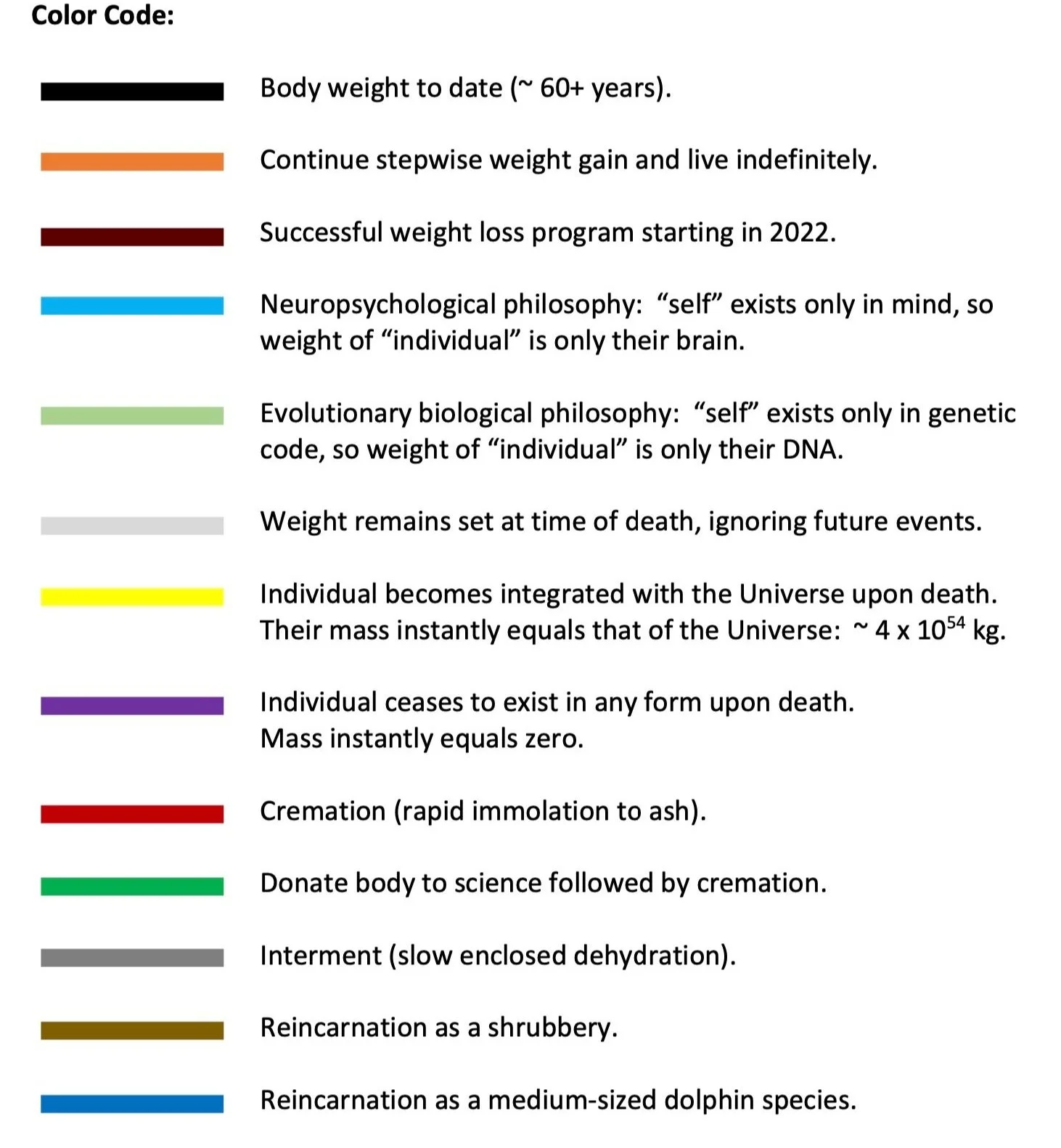 This work depicts multiple possible pathways of weight during life and after death. It’s basically a line graph of my weight in kilograms (vertical axis) across time (horizontal axis). Birth is at time 0, the thinner vertical black line at center is my age when this work was created (~ 60), the thicker vertical black line 2/3 of the way across predicts when I may die (about age 80?), and a thin dashed vertical line marks 100 years.