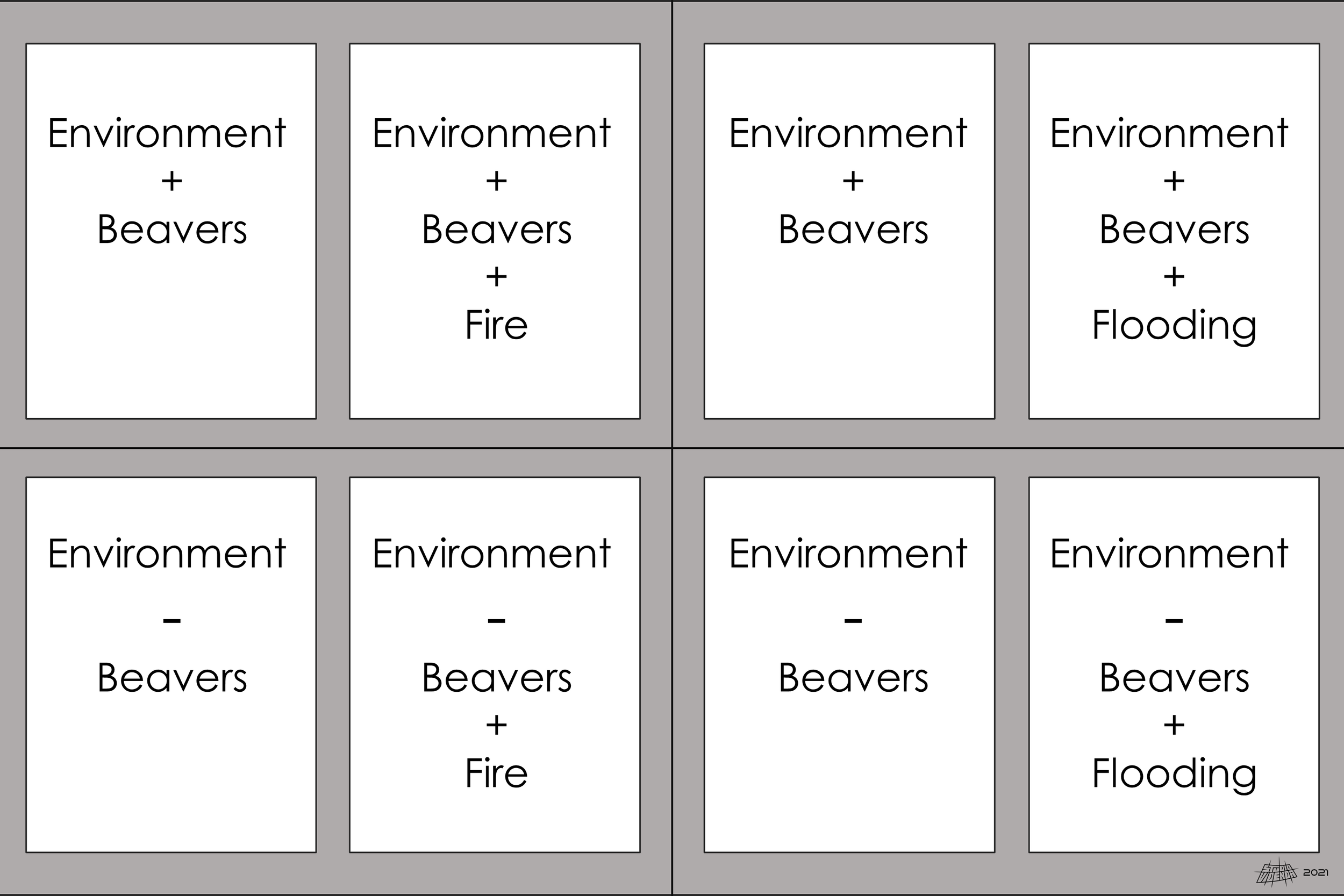Column one of each matrix is the same: a headwater valley with vs. without beavers. Column two imposes wildfire or flooding on the baseline conditions shown in column one. Yes, the work could also have been a single 2 x 3 matrix, but that would deny the independent and disparate nature and impact of wildfires vs. floods.